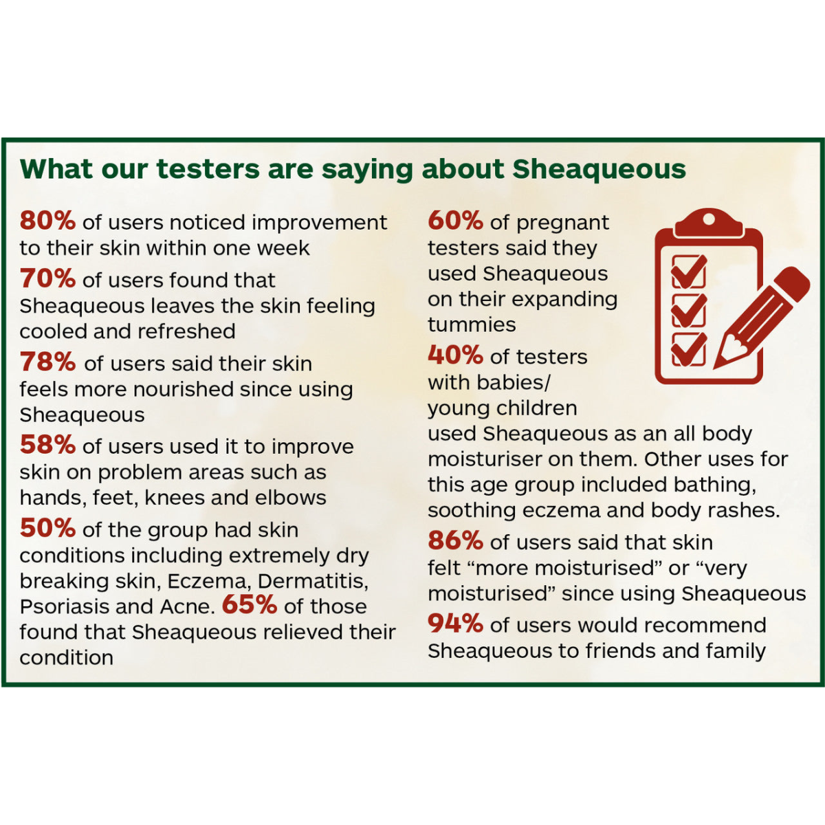 Additionally, 94% would recommend Sheaqueous Cream to friends and family.