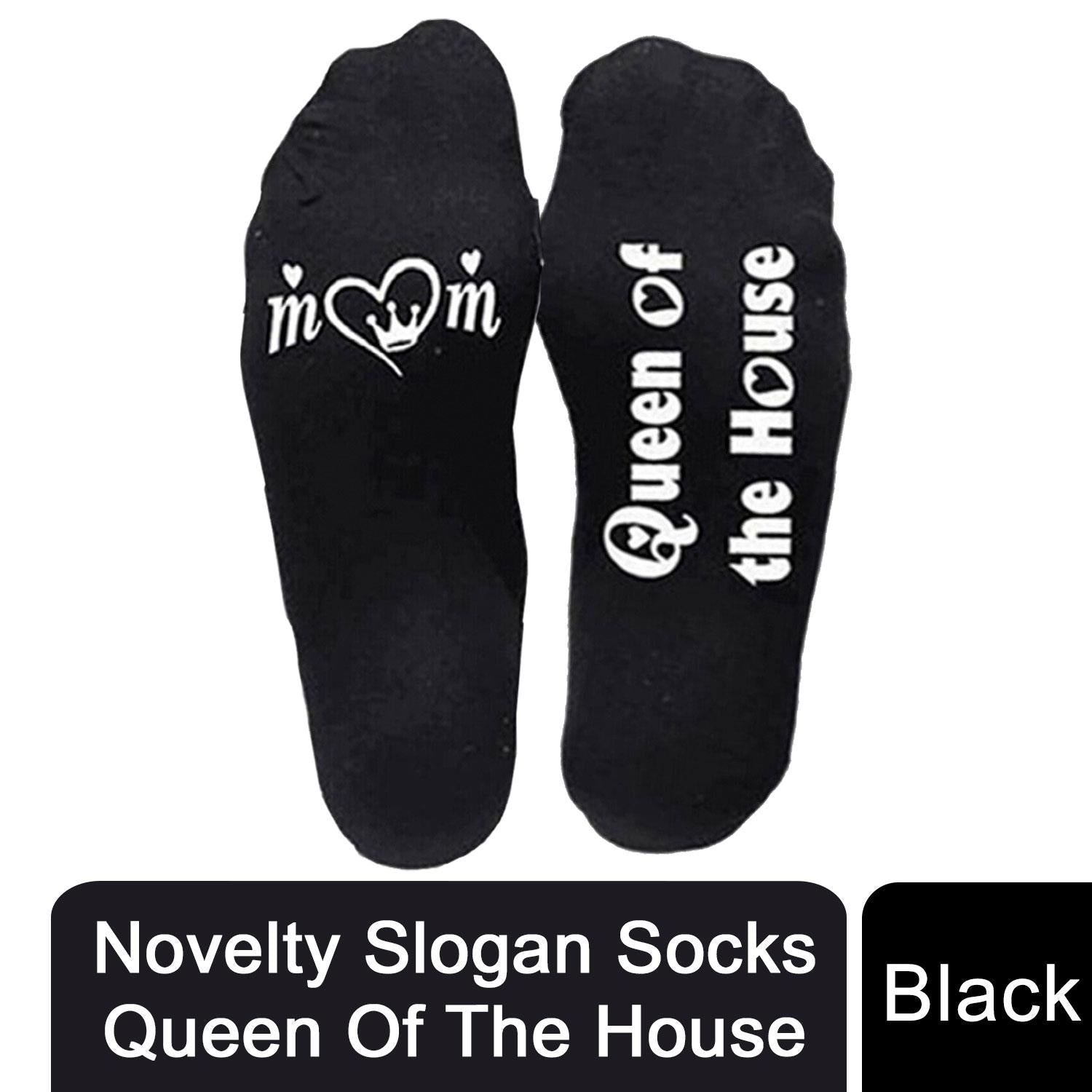 Flo Novelty Cotton Mid Calf Socks with Funny Slogans, Queen of the House, Black