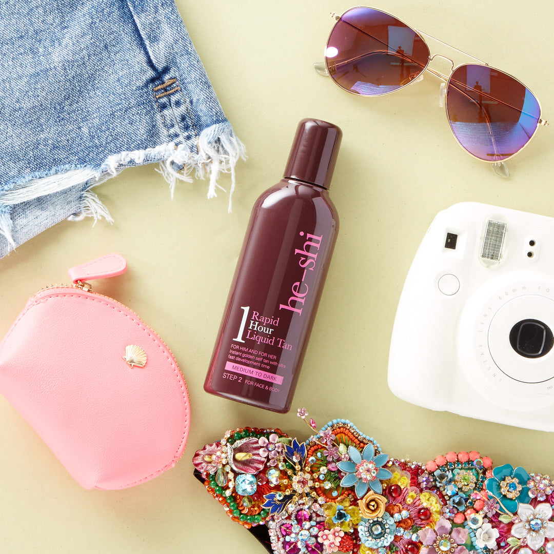 He-Shi Rapid 1 Hour Liquid Tan is a must have for those time compressed tanners. The self-tanner is ultra-lightweight, easy to apply and fast absorbing, giving you an instant golden glow that last up to 7-10 days.  Infused with our colour depth technology, to enhance the delivery and penetration of active tanning agents to help control the intensity of your tan. Leave for 1 hour for a medium finished colour, 2-3 hours for a dark finished colour and 3-4 hours for an ultra-dark finished colour.      SKIN LOVING INGREDIENTS •96% natural ingredients  •Suitable for face and body •Isopentydiol* provides instant hydration to help prolong tanning results, so you can keep glowing for up to 7-10 days * Clinically proven to increase moisture by 110% within 5 minutes•Pentavitin* instantly hydrates, while providing long lasting tanned and nourished skin. *Clinically proven to increase the hydration of skin by up to 40%.•Enriched with Vitamin E, Avocado, Argan and Jojoba Seed Oil for ultimate skin hydration, ensuring even fade and non-streaking•Odour neutralising signature scent - White Nectarine & Pear for that no self-tan smellHe-Shi products are vegan and cruelty free. Formulated without alcohol, parabens, palm oil, mineral oil and sulphates. Products include the highest grade of natural ingredients possible to give a natural looking flawless tan.