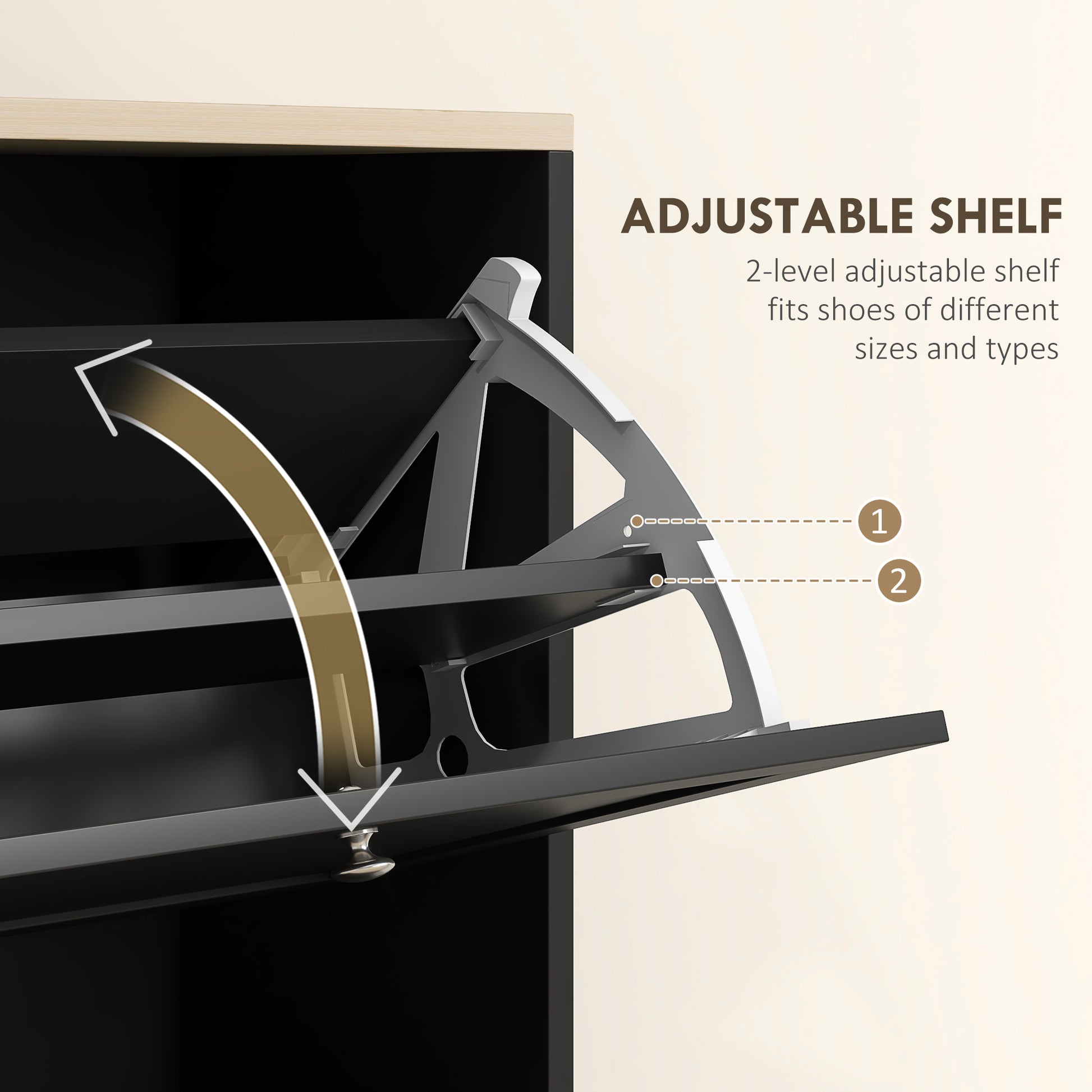 ● Two-level adjustable shelf in each drawer, to fit in differently-sized footwear ● Quality particle board structure, with a protective melamine coating