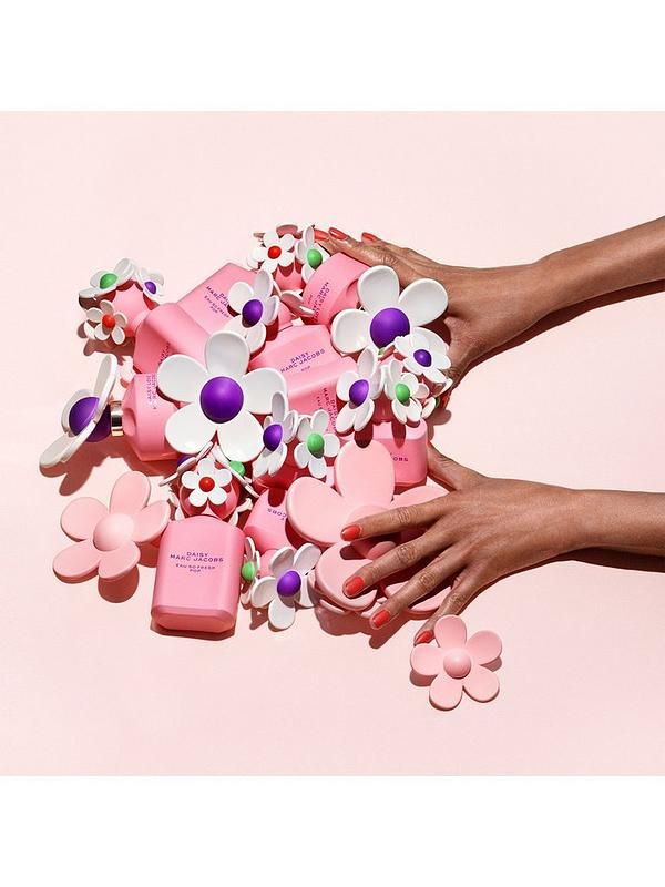 Juicy. Surprising. Fun. Introducing Marc Jacobs Daisy Eau So Fresh Pop. Immerse yourself in the colorful world of Marc Jacobs with the brands most fashion-forward limited-edition olfactory creations to date. Bursting with fresh lemon, pear, and lime, Marc Jacobs Daisy Eau So Fresh Pop presents a juicy and unexpectedly gourmet fragrance. Its heart is adorned with the floral essence of velvety rose, accentuated by a playful burst of fruity raspberry and violet, imparting an aura of timeless elegance. Balanced by earthy musk and crystal moss, the warm embrace of cedarwood envelops the heart notes of this olfactory creation, leaving a trail of invigorating aromas in its wake. Housed in a limited-edition matte pink bottle, this lively, fun-spirited fragrance draws inspiration from the color block and distinctive textures featured throughout Marc Jacobs fashion collections. The eye-catching playful bottles are reimagined in full matte pink with pops of purple, green, and red giving the caps a surprising twist!